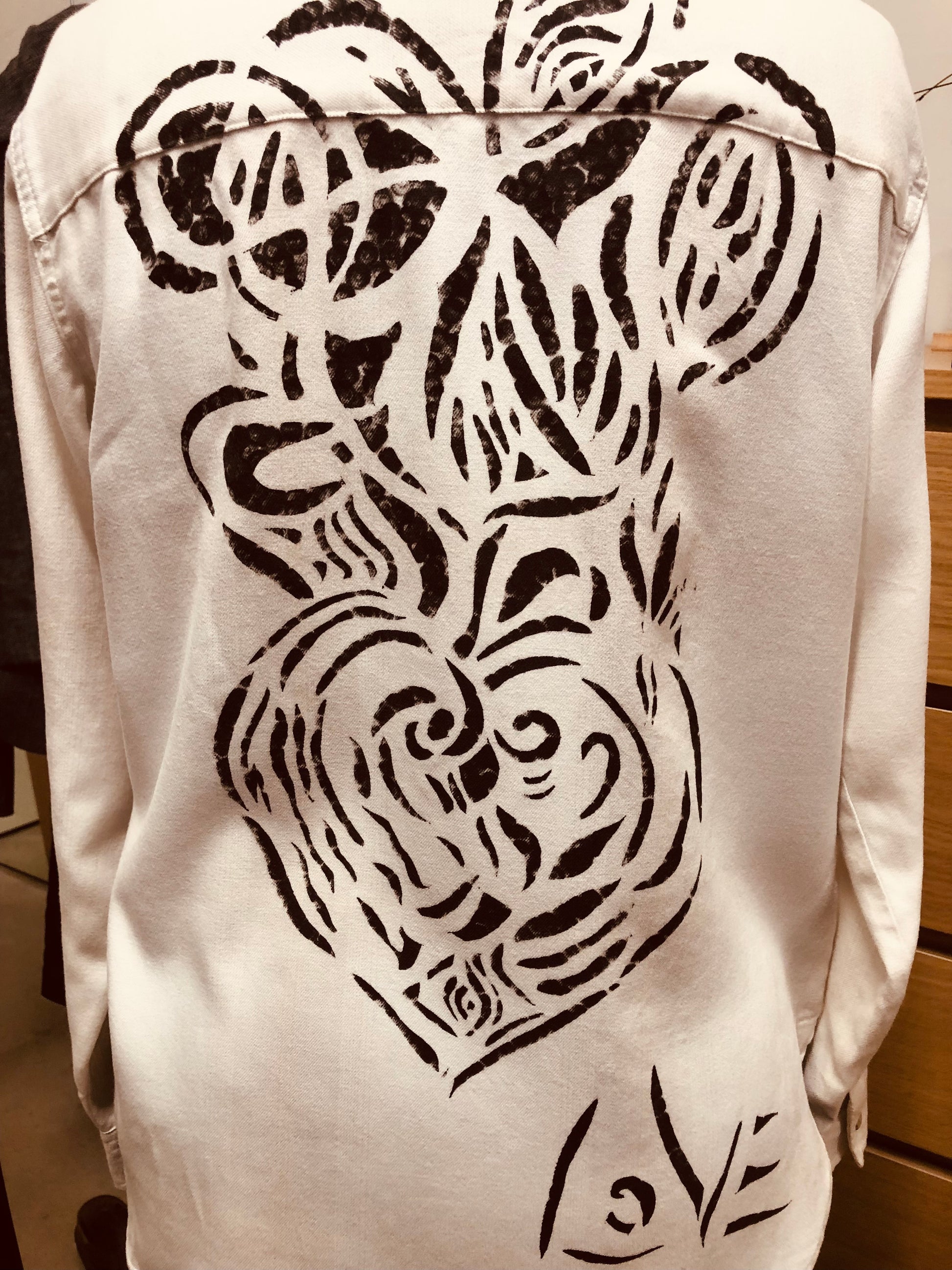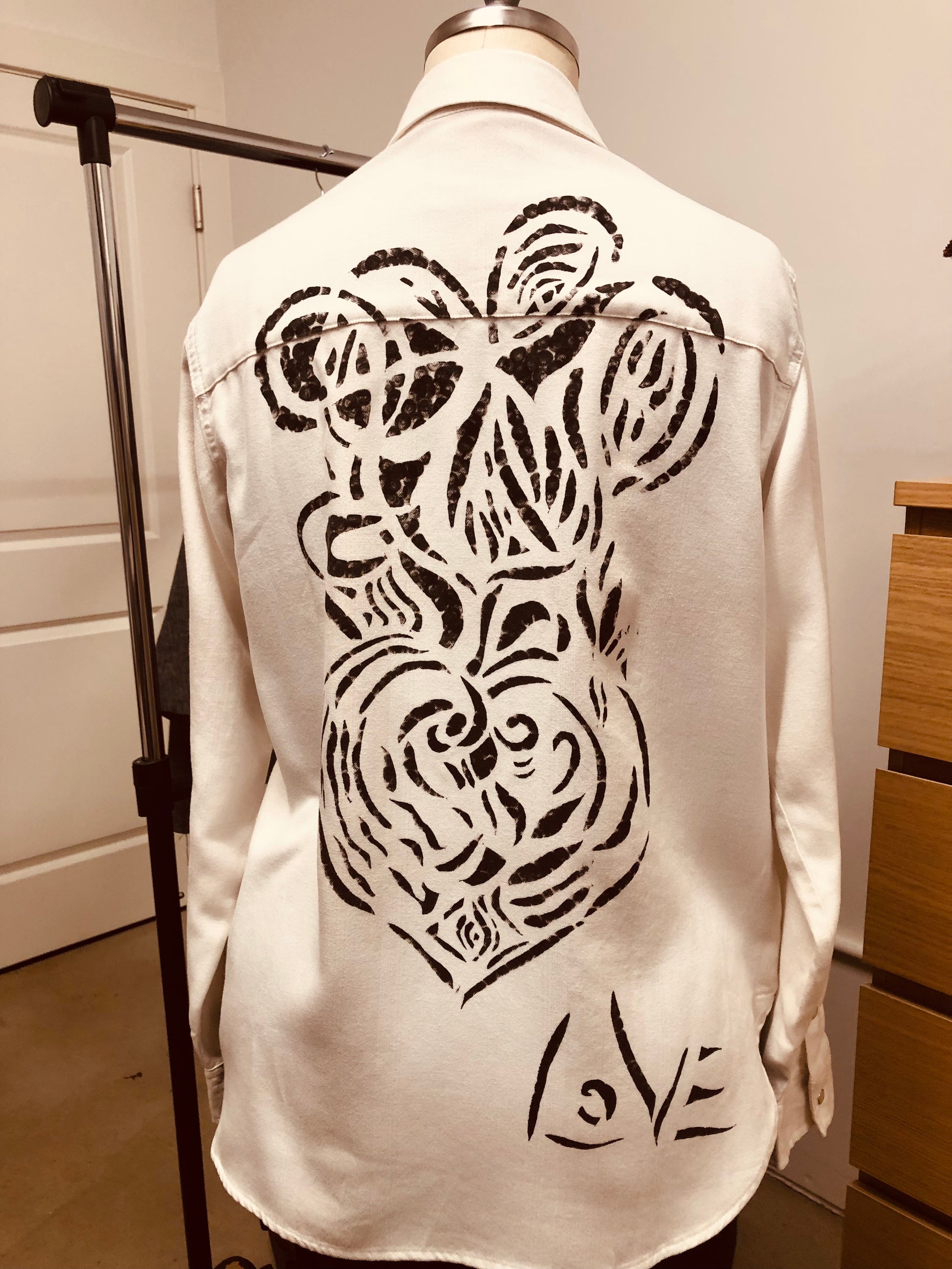 Soft flannel shirt I hand-stenciled with my “Love 2” design on the back . This women's shirt features convenient snap closures and pockets.